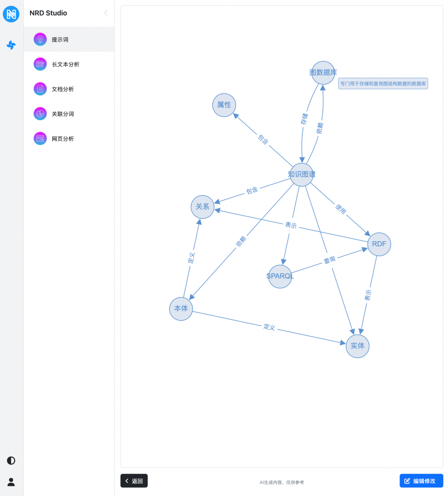 在NRD Studio中,动态关系图谱与思维导图由不同的AI内核驱动:前者主要采用DeepSeek-V3,后者则使用专用的推理模型。尽管构建初衷不同,但它们在后期均支持相互转换,方便您进行二次编辑。