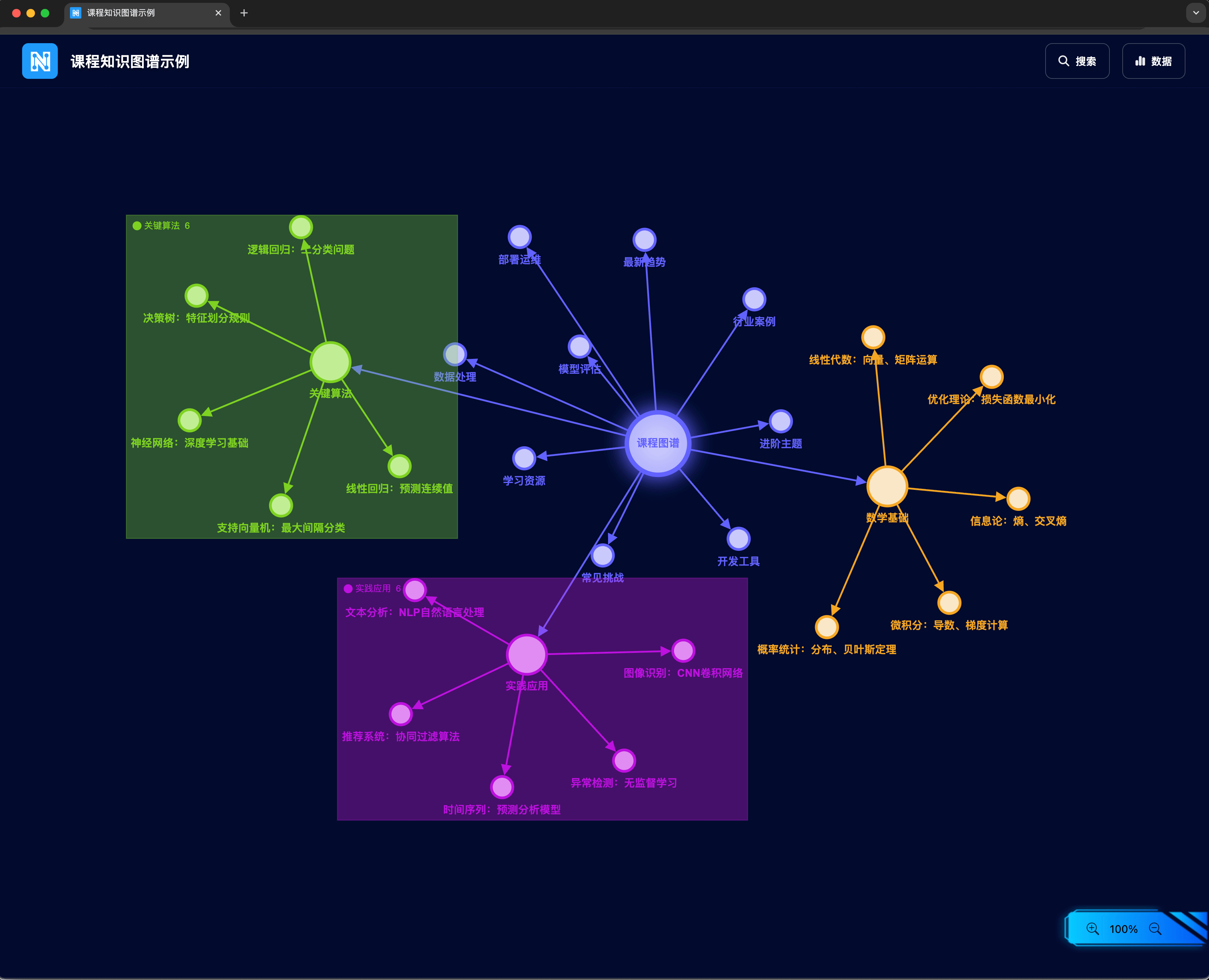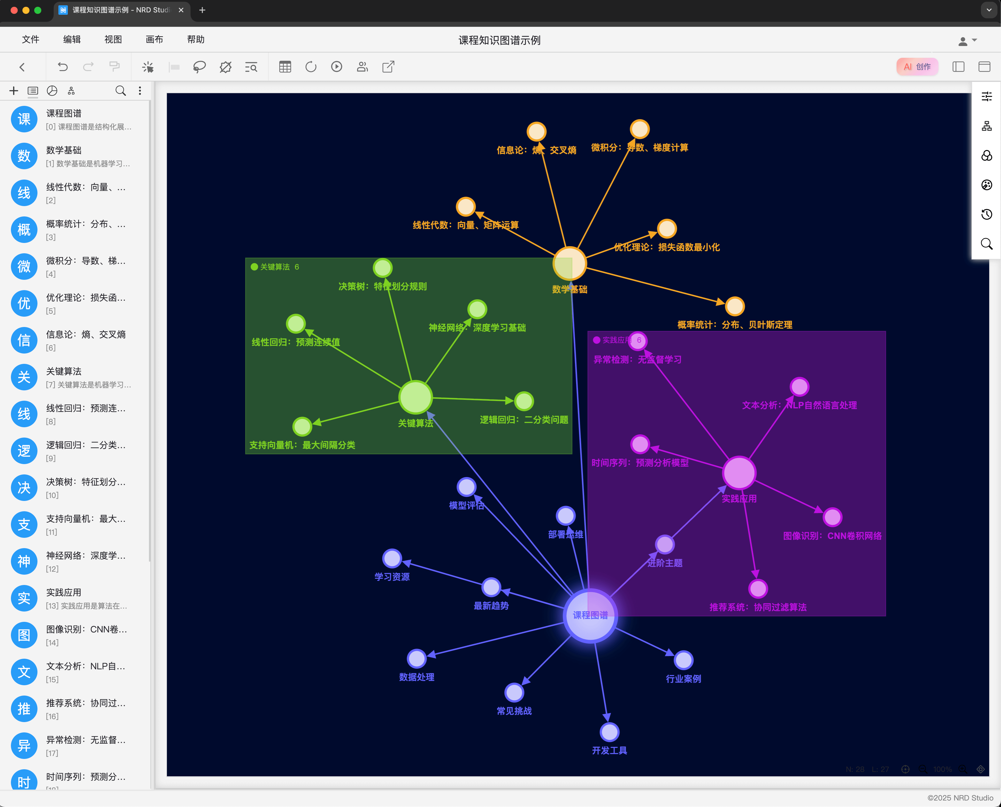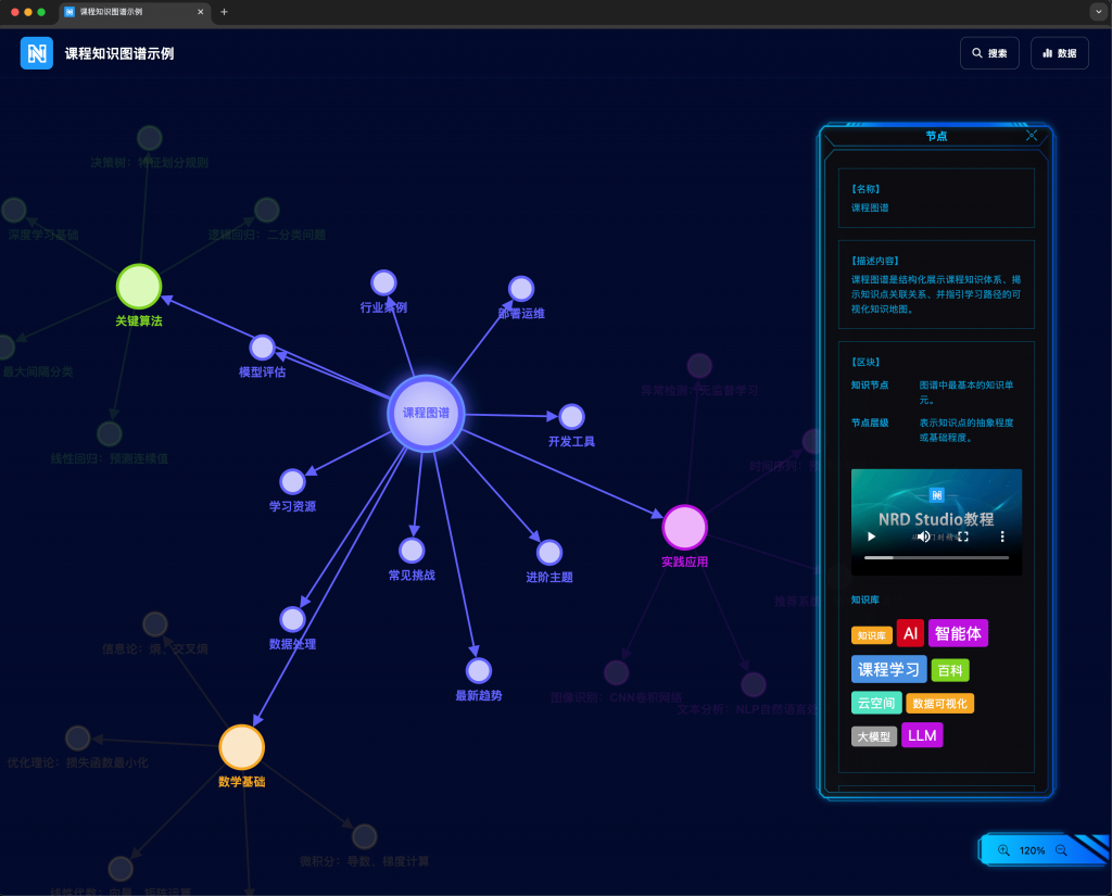 AI课程知识图谱是NRD Studio内置的一个特色主题,十分适合在校师生使用,网页版无需配置任何复杂的运行环境,也不需要编写程序,而是通过可视化编辑器,拖拽图形、输入数据后,就能轻松绘制得到课程图谱。