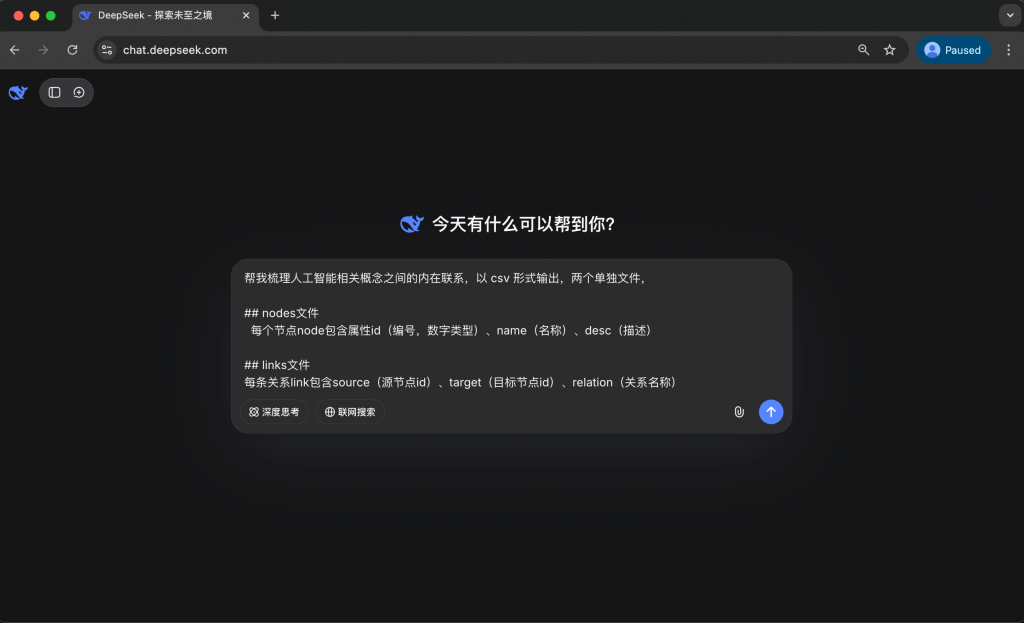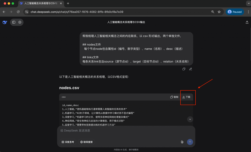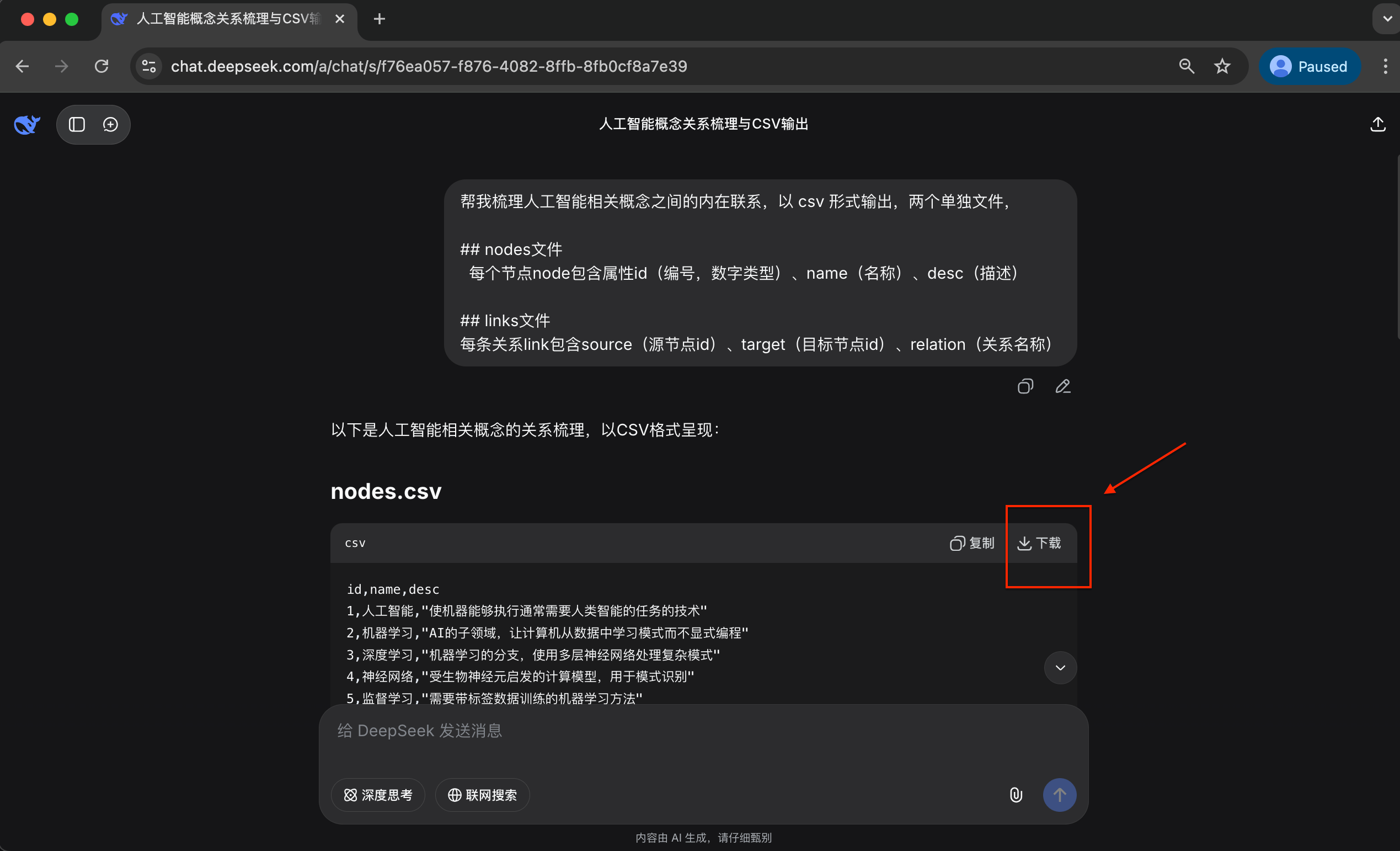 DeepSeek + NRD Studio 生成CSV知识图谱文件的提示词指令参考: